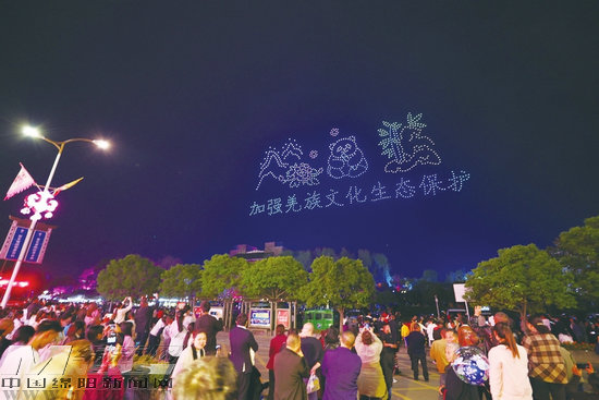 當晚,在禹王橋至南橋安昌河空域,一千臺無人機同時升空,為現場游客帶來了一場科技與藝術完美融合的視覺盛宴。“走北川·過羌年”、“篝火+萬人沙朗”、“大禹故里·中國羌城”、“熊貓”等圖形和字樣不斷變化,各種美輪美奐的圖案閃耀璀璨、光彩奪目,與安昌河畔的夜景相得益彰,吸引大量市民游客駐足觀賞,拍照打卡。此次無人機表演精心安排了17組精美絕倫的造型表演,融合羌族特色元素,多維度、多角度地展示通航前沿技術。這場盛大的無人機燈光秀也是北川低空經濟蓬勃發展的生動展現。