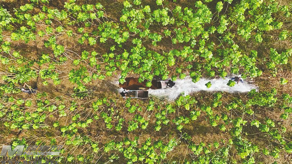 游仙區鹽泉鎮玉溪村蠶桑產業園,工人們在桑林間撒石灰、插菌種