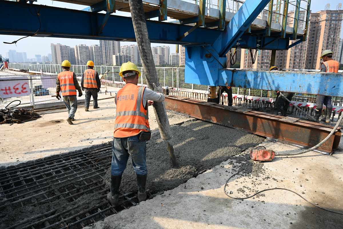成渝中線高鐵動走線跨沙河特大橋位于四川省成都市金牛區(qū),全長約1.47公里,以現(xiàn)澆連續(xù)梁方式跨越沙河、既有駟馬橋城市主干道路、成都地鐵3號線及新建客機(jī)整備所西咽喉區(qū)。其中,主跨采用“掛籃懸臂澆筑施工法”施工,施工人員將連續(xù)梁分為14個標(biāo)準(zhǔn)節(jié)段施工,共澆筑混凝土9000余立方米,相當(dāng)于約4個奧運會標(biāo)準(zhǔn)游泳池的容量。
