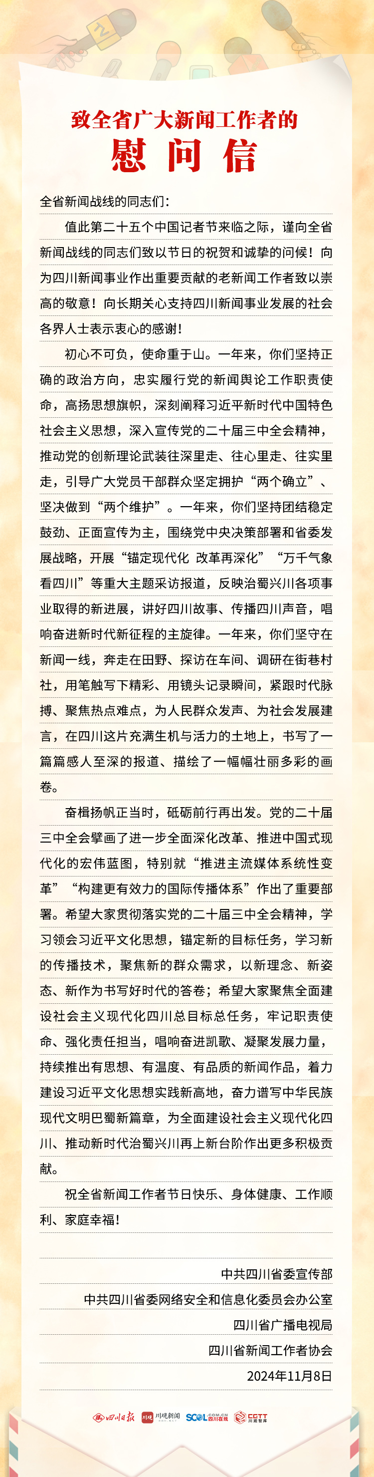 奮楫揚帆正當時,砥礪前行再出發。黨的二十屆三中全會擘畫了進一步全面深化改革、推進中國式現代化的宏偉藍圖,特別就“推進主流媒體系統性變革”“構建更有效力的國際傳播體系”作出了重要部署。希望大家貫徹落實黨的二十屆三中全會精神,學習領會習近平文化思想,錨定新的目標任務,學習新的傳播技術,聚焦新的群眾需求,以新理念、新姿態、新作為書寫好時代的答卷;希望大家聚焦全面建設社會主義現代化四川總目標總任務,牢記職責使命、強化責任擔當,唱響奮進凱歌、凝聚發展力量,持續推出有思想、有溫度、有品質的新聞作品,著力建設習近平文化思想實踐新高地,奮力譜寫中華民族現代文明巴蜀新篇章,為全面建設社會主義現代化四川、推動新時代治蜀興川再上新臺階作出更多積極貢獻。