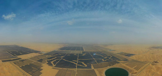在內蒙古自治區鄂爾多斯市境內的庫布其沙漠里,一排排光伏板整齊地排列著,像是一幅藍色畫布在沙海中熠熠生輝。然而在過去,“黃沙遮天日,飛鳥無棲樹”是人們對這片沙海的印象。