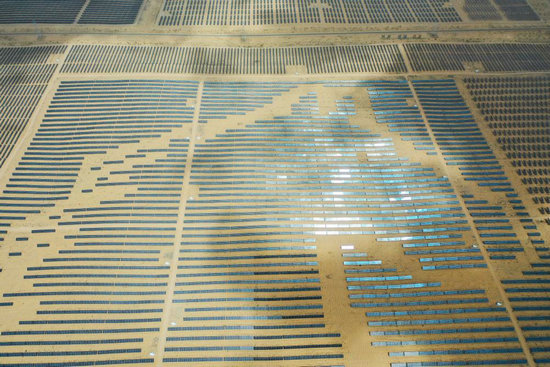 在幾十公里外的達拉特旗光伏發電應用領跑基地,一塊塊光伏板連成一片,墨藍色的“光伏長城”閃閃發光。