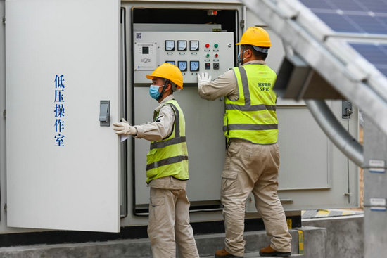 4月20日,工作人員在達拉特光伏發電應用領跑基地巡檢。新華社記者 王澤聰 攝
