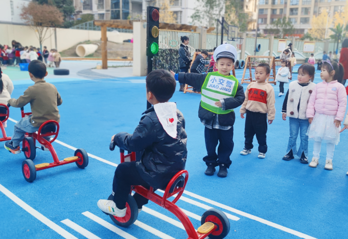 活動伊始,老師們借助《小熊過馬路》等繪本故事,向幼兒講解交通標識、信號燈意義、過馬路的正確方法以及遵守交通規則的重要性。隨后,操場搖身變為“交通演練場”,設有模擬十字路口、交通標志認知區、行人過街體驗區等。孩子們在模擬十字路口,認真觀察信號燈的變化,學著交警叔叔的模樣,有模有樣地指揮交通;在交通標志認知區,積極討論標志的含義與用途;在行人過街體驗區,幼兒們排著整齊的隊伍,等待綠燈亮起后,小心翼翼地走過“馬路”......通過這些豐富的體驗活動,孩子們不僅對交通規則有了更直觀深刻的理解,也在實踐中提升了自己的交通安全意識與自我保護能力。