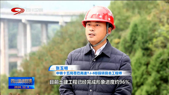 中鐵十五局蒼巴高速TJ-5標段項目總工程師 張玉明:目前土建工程已完成形象進度約96%,路面工程已完成約69%,為加快施工進度,爭取早日通車,四季度我們積極增加資源配置,科學倒排工期,以日考核來保節(jié)點,確保年底前完成土建工程,春節(jié)前完成路面工程。