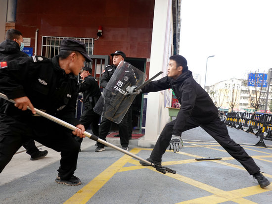 在各班級內,聽到廣播指令后,教師們迅速行動,關閉門窗,指導學生藏身于課桌下,并用桌椅加固教室出入口,形成有效的防護屏障,防止“歹徒”闖入。操場上,安州區巡特警隊迅速出擊,成功制服一名“歹徒”,并抓獲其“同伙”,及時消除了模擬的安全威脅。