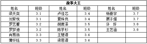 故事大王:在故事的王國里,有一群耀眼的明星,他們就是我們的“故事大王”。他們有著天馬行空的想象,能把平凡的故事講得跌宕起伏;他們有著生動的語言,好似神奇的畫筆,描繪出一個個栩栩如生的世界。無論是古老的傳說,還是現代的趣事,一經他們之口,就像被賦予了魔力,緊緊抓住聽眾的心,你們當之無愧,是故事世界的王者!