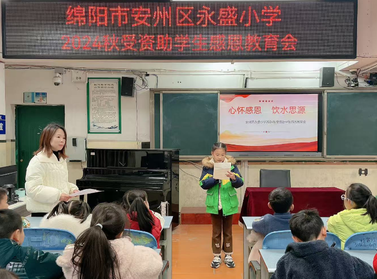 12月13日,安州區永盛小學舉行了2024年秋受資助學生感恩教育會,旨在培養學生感恩之心,強化資助育人成效。