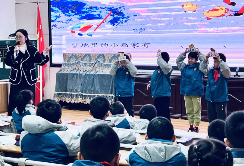 賈麗老師展示《雪地里的小畫家》一課,引領師生共赴奇妙的冬日之約,打造出一堂熠熠生輝的低年級語文課堂盛宴。整堂課流暢自然,導入課題富有童真,隨文識字富有童趣,著眼細處富有童心,多種形式朗讀富有童稚。賈老師的聲音親切極富感染力,學生在童詩的課堂中暢所欲言,興味盎然。賈老師一開課便施展出“情境魔法”,用美輪美奐的“森林下雪”動畫,將孩子們瞬間“傳送”至白雪皚皚的夢幻林間,喚醒他們心底對雪的喜愛與玩雪趣事回憶,課堂瞬間升溫。“雪地畫展闖關”任務主線巧妙串起教學全程,牢牢牽住孩子們的好奇心,使其全程專注、熱情高漲。