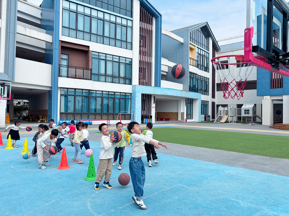 籃球運動涵蓋了走、跑、跳、投等多種身體運動形式,能全面、有效、綜合促進身體素質發展。老師以游戲的形式開展活動,重點培養孩子們對籃球的探究興趣,豐富對籃球運動的動作技能。隨著他們肢體控制能力增強,籃球技術內容教學比例逐漸增加,從拍球、傳球、投籃等基本的籃球技術練習到多種運球、傳球、投籃技術學習,從而加強規則意識、團隊意識、競爭意識的養成,培養他們速度、耐力、靈敏、協調性全面發展。