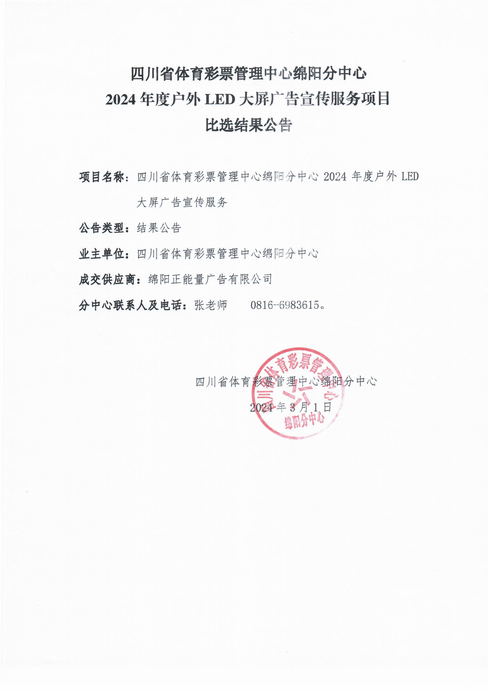 四川省體育彩票管理中心綿陽分中心2024年度戶外ED大屏廣告宣傳服務項目比選結果公告