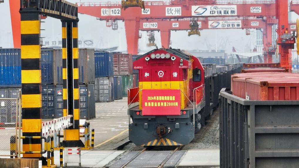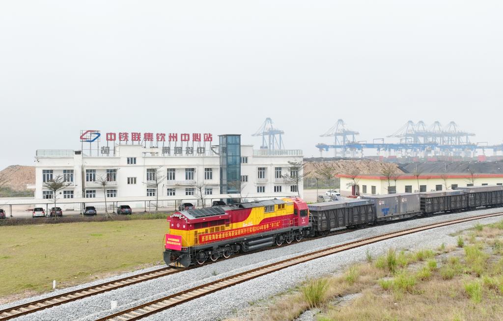 3月17日上午,一列滿載緬甸黑芝麻、海南椰子汁、廣西白糖等貨物的海鐵聯運班列,從欽州鐵路集裝箱中心站緩緩發出駛向四川城廂站。這是2024年西部陸海新通道開行的第2000列海鐵聯運班列,同比增長16.8%,提前14天完成一季度班列開行任務。