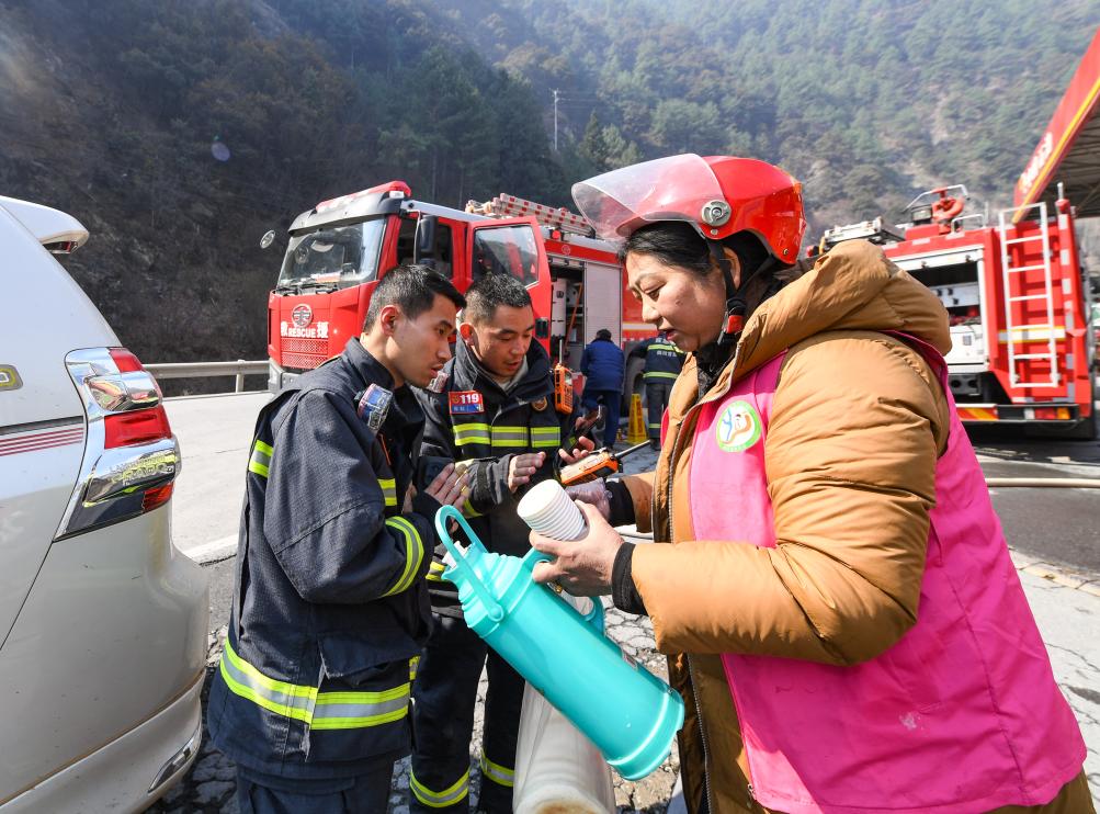 3月18日,在四川省甘孜藏族自治州雅江縣,彭三妹(右)為剛從火場撤下來的消防員送上饃饃和熱水。