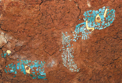 商代龍形綠松石鑲金飾件是“鎮館之寶”之一。“它發現于2014年元旦當天,大家開玩笑說這是一份新年禮物。”盤龍城遺址博物院考古研究部主任王穎說。泥土中,綠松石碎片排列成奇特的圖案,中間兩只純金的“眼睛”歷經數千年仍熠熠生輝。經過考古復原,這些綠松石與黃金片組合成一首雙身的龍形,十分精致美麗。在河南偃師二里頭遺址發現過嵌綠松石銅牌飾,但其中未見黃金。盤龍城發現的商代早期綠松石鑲金飾件十分罕見,吸引了許多人來此“尋龍”打卡。