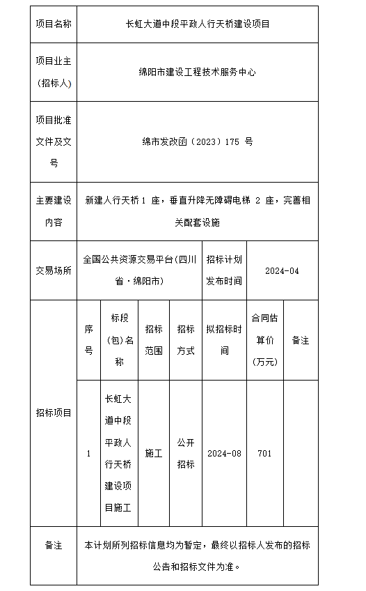 長虹大道中段平政人行天橋建設項目招標計劃表