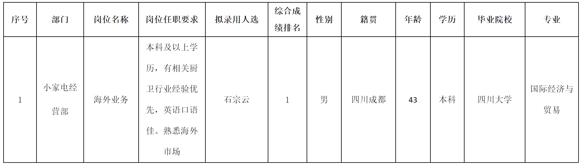根據長虹美菱日電科技有限公司發布的招聘公告及招聘相關規定,經面試程序,擬錄用石宗云同志到長虹美菱日電科技有限公司工作,現予以公示,具體情況如下: