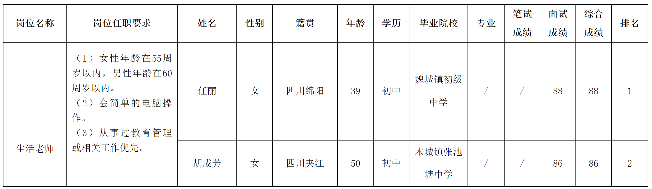 根據綿陽中學實驗學校發布的招聘公告及招聘相關規定,經面試等程序,現將成績予以公示。