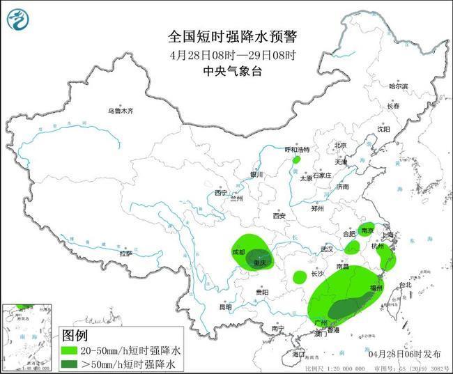 預(yù)計,4月28日08時至29日08時,內(nèi)蒙古中部、陜西北部、山西北部、四川盆地中東部、重慶西部、廣東東部、福建南部等地部分地區(qū)有大到暴雨,其中,廣東東部、福建東南部等地局地有大暴雨(100~180毫米)。上述部分地區(qū)伴有短時強降水(最大小時降雨量30~50毫米,局地可超過60毫米),局地有雷暴大風(fēng)等強對流天氣。