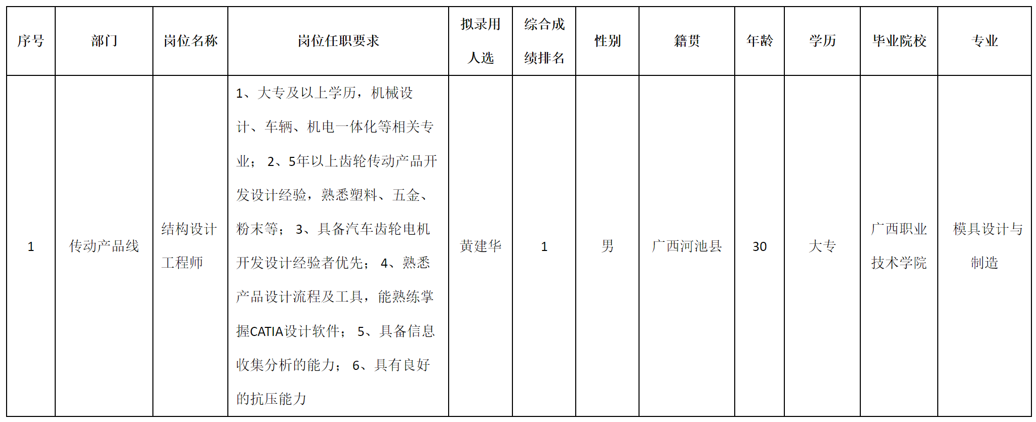 根據四川安和精密電子電器股份有限公司發布的招聘公告及招聘相關規定,經筆試、面試、考察、體檢等程序,擬錄用黃建華同志到四川安和精密電子電器股份有限公司工作,現予以公示,具體情況如下: