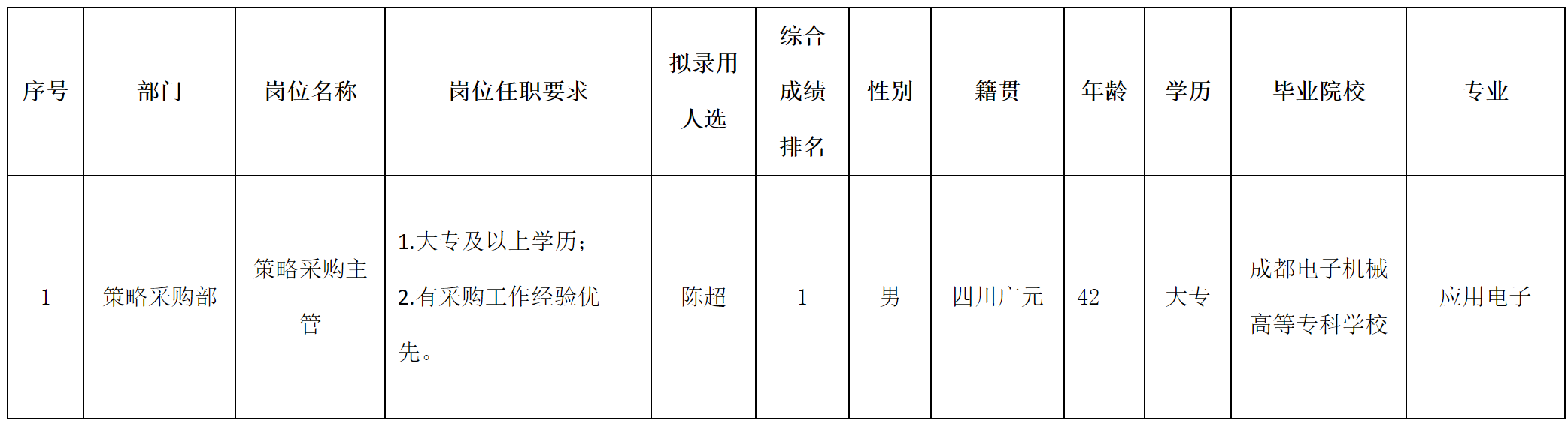 根據四川愛聯科技股份有限公司發布的招聘公告及招聘相關規定,經面試、考察、體檢等程序,擬錄用陳超同志到策略采購部工作,現予以公示,具體情況如下: