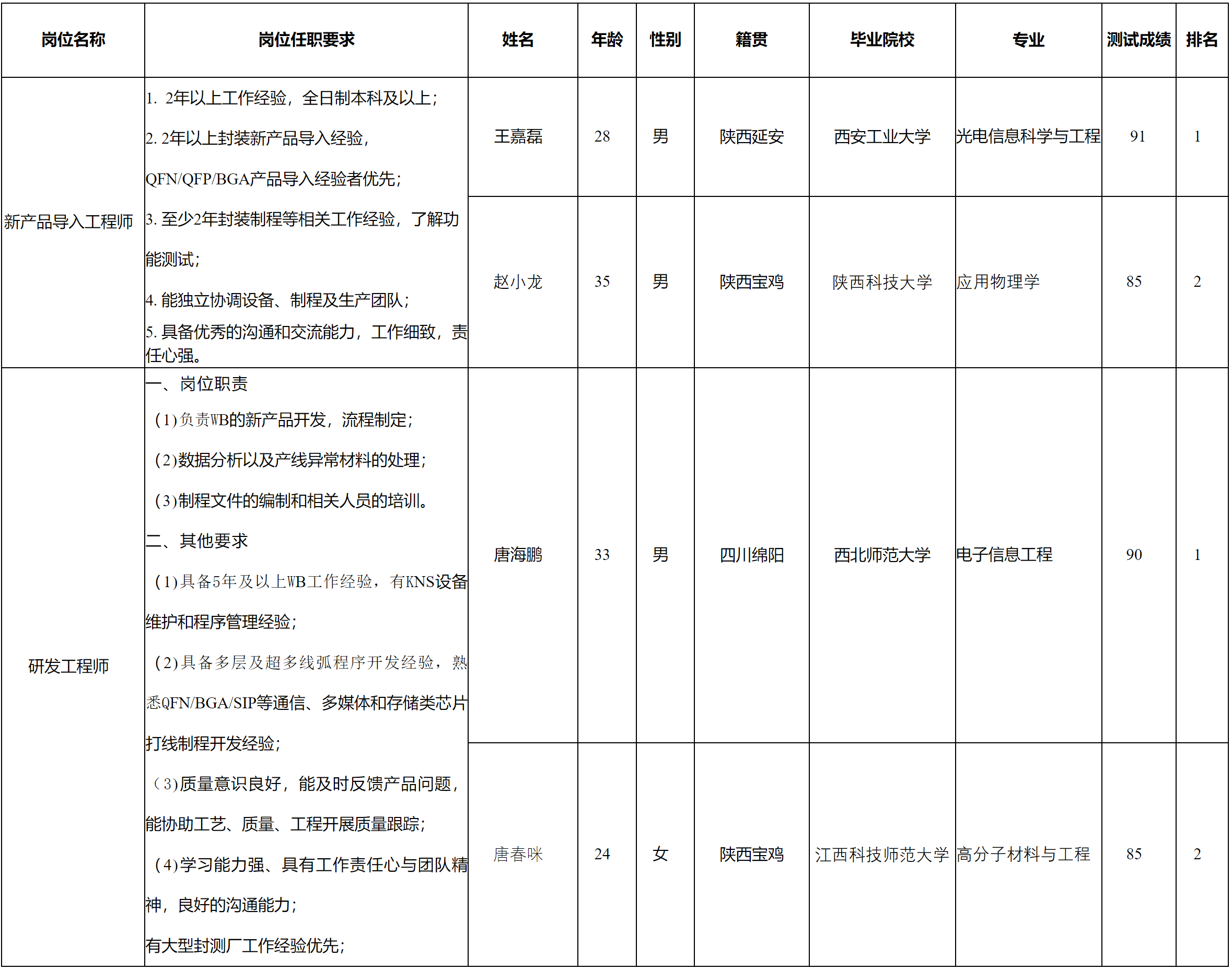 根據(jù)四川啟賽微電子有限公司發(fā)布的招聘公告及招聘相關規(guī)定,經(jīng)用人單位面試程序,現(xiàn)將測試合格人員予以公示。