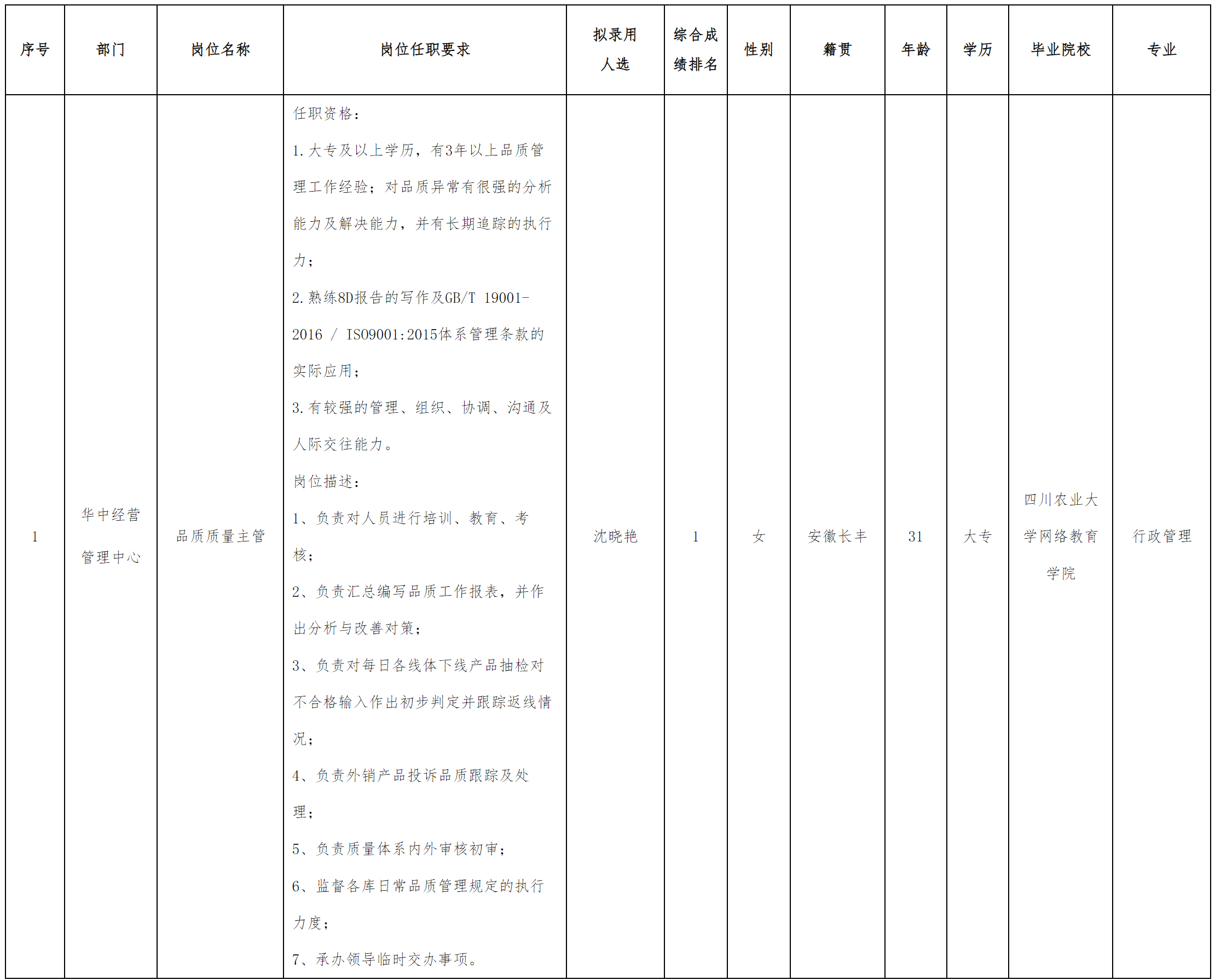 根據四川長虹民生物流股份有限公司發布的招聘公告及招聘相關規定,經筆試、面試、考察、體檢等程序,擬錄用沈曉艷同志到華中經營管理中心工作,現予以公示,具體情況如下: