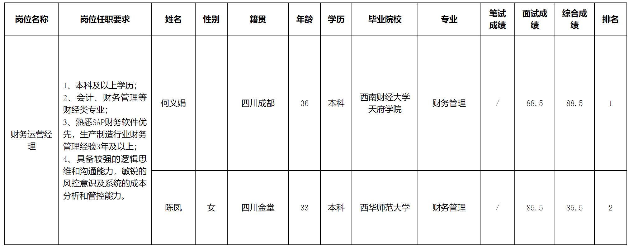 根據四川長虹潤天能源科技有限公司發布的招聘公告及招聘相關規定,經面試程序,現將面試成績予以公示。