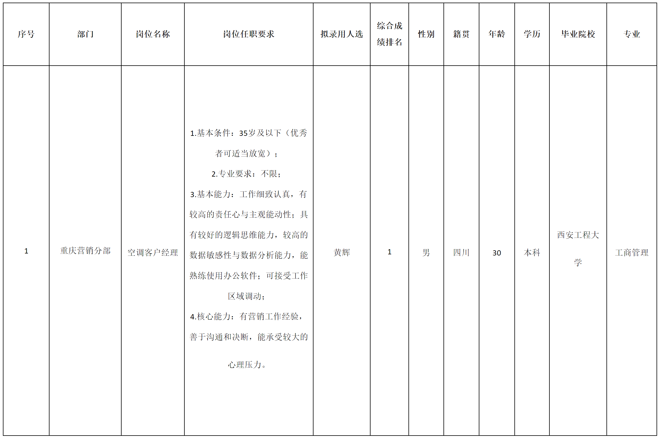 根據四川智易家網絡科技有限公司(長虹·美菱中國區)發布的招聘公告及招聘相關規定,經面試、考察、體檢等程序,擬錄用黃輝同志到重慶營銷分部工作,現予以公示,具體情況如下: