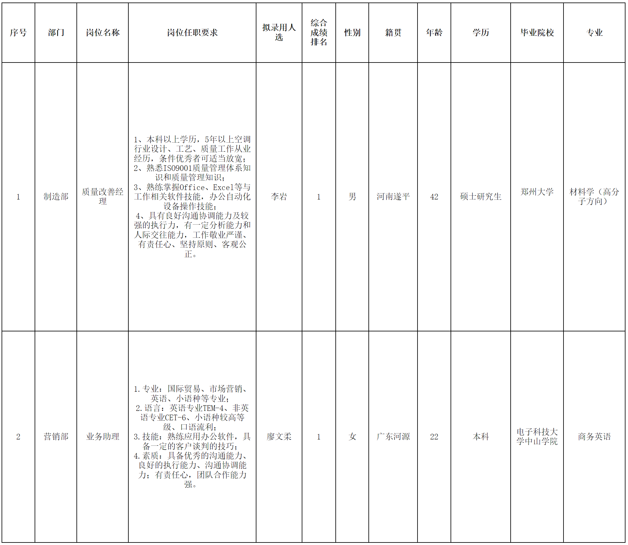 根據中山長虹電器有限公司發布的招聘公告及招聘相關規定,經面試、考察、體檢等程序,擬錄用李巖同志到質量改善經理崗位工作,現予以公示,具體情況如下: