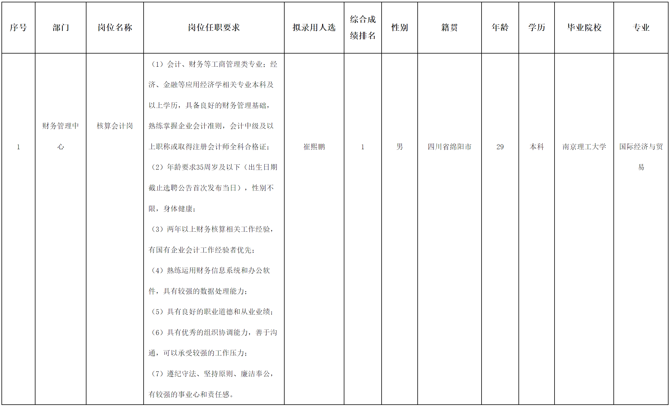 根據(jù)綿陽市投資控股(集團)有限公司發(fā)布的招聘公告及招聘相關規(guī)定,經(jīng)筆試、面試、考察、體檢等程序,擬錄用崔熙鵬同志到綿陽市投資控股(集團)有限公司工作,現(xiàn)予以公示,具體情況如下: