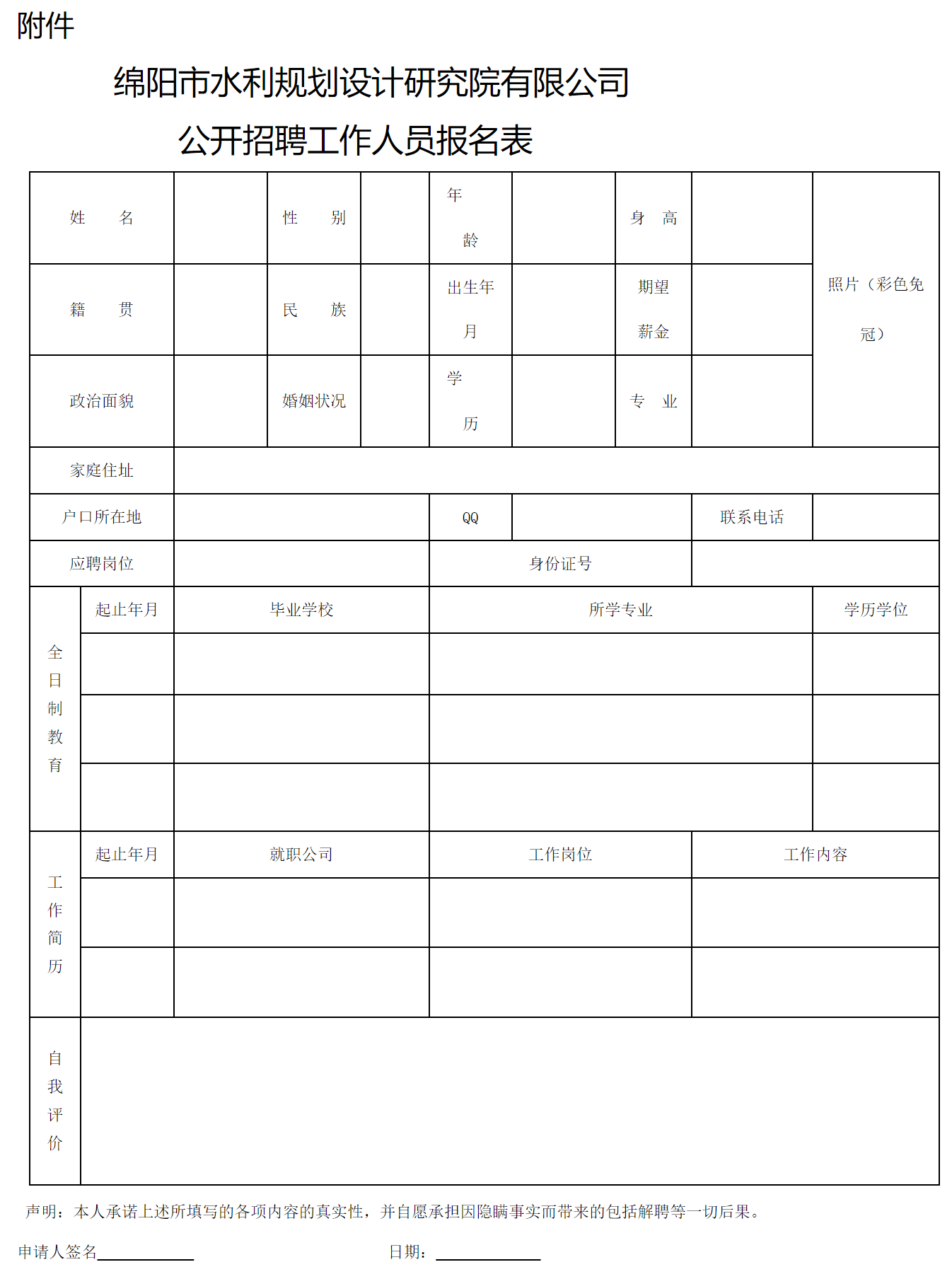 附件:綿陽市水利規(guī)劃設計研究院有限公司公開招聘工作人員報名表