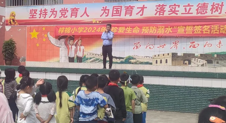 為了進一步增強在校學生對法律知識的了解和防溺水安全意識,切實維護在校學生合法權益,幫助學生知敬畏、強能力,樹立知法、懂法、守法的意識。4月26日下午,游仙區鹽泉鎮梓棉小學特邀法治副校長、信義派出所民警胥警官給全體師生開展了以“法治教育進校園,護航青春助成長”為主題的講座暨防溺水安全教育主題宣傳活動。