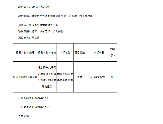 清水橋至九綿高速桂溪服務區公路新建工程正式用電中標結果公告