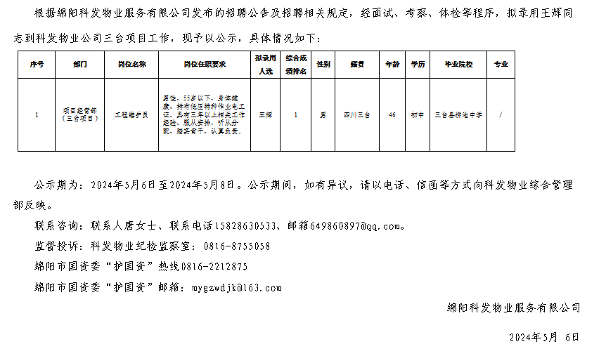 綿陽科發物業服務有限公司關于招聘三臺項目工程維護員崗位擬錄用人員的公示
