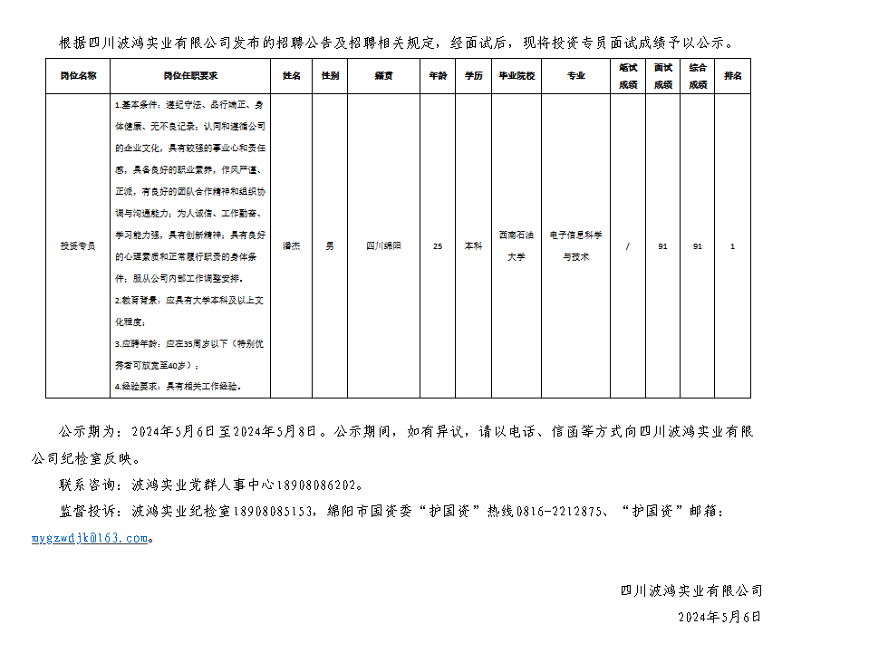 四川波鴻實業有限公司關于招聘投資專員測試成績的公示