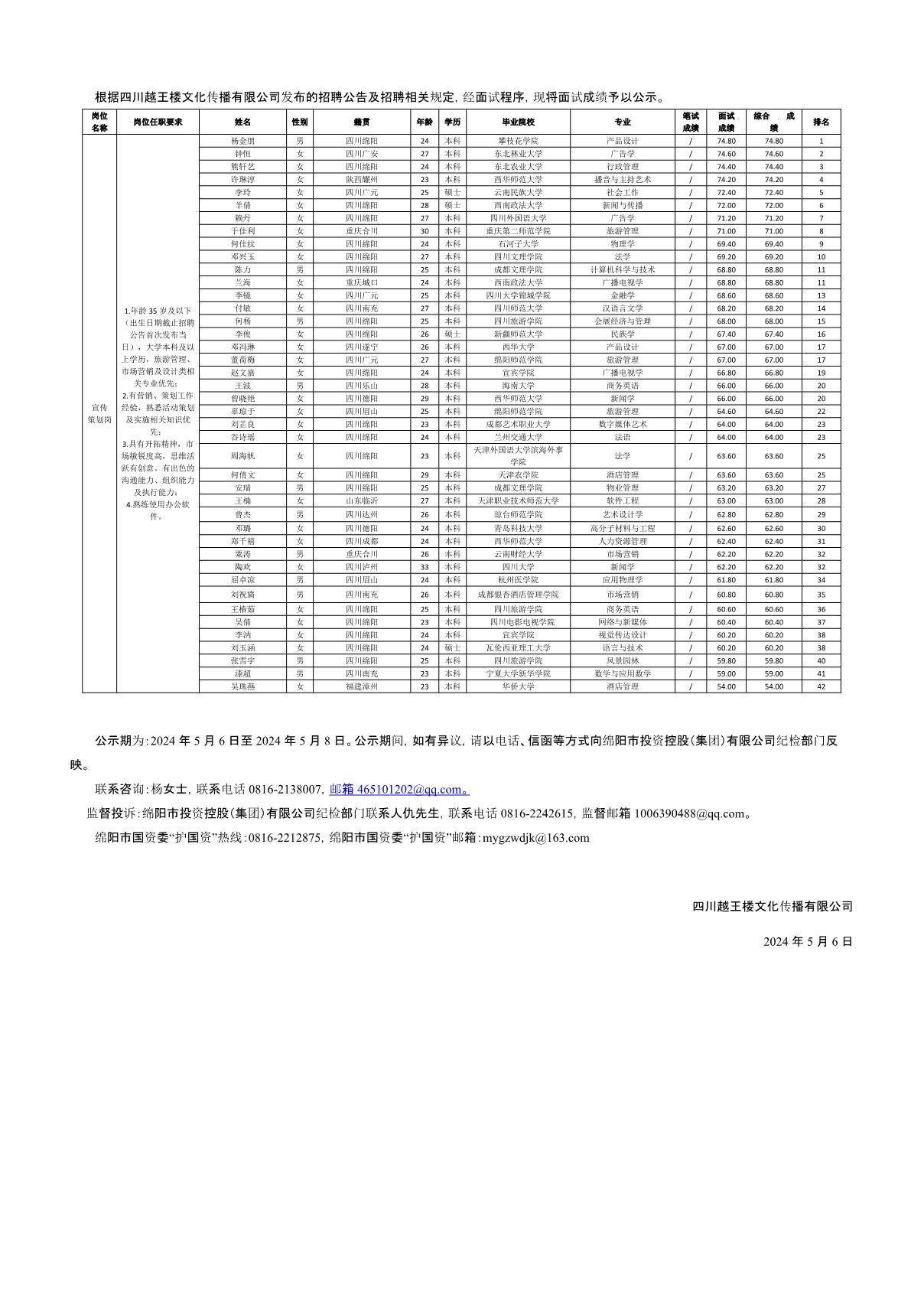 四川越王樓文化傳播有限公司關于招聘宣傳策劃崗位測試成績的公示