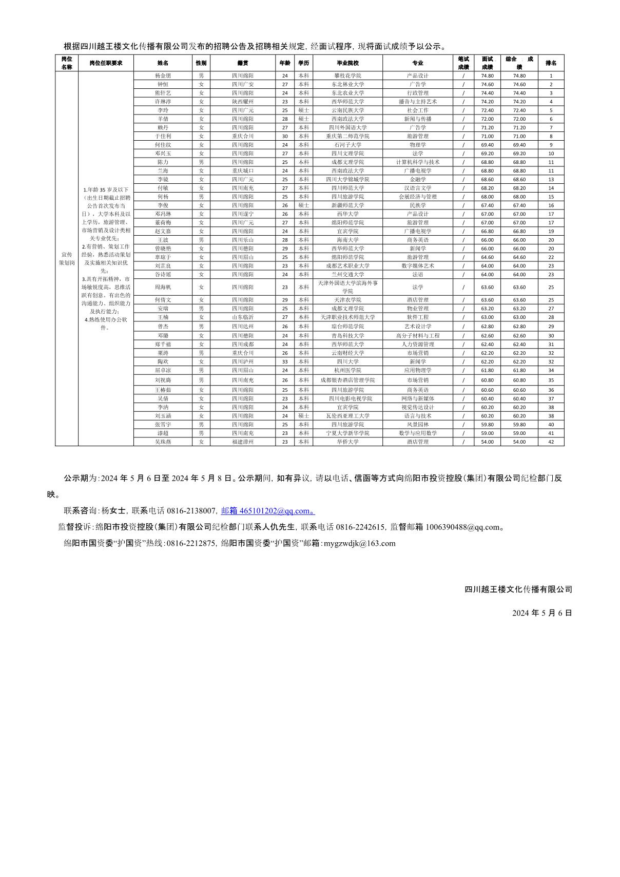 四川越王樓文化傳播有限公司關(guān)于招聘宣傳策劃崗位測試成績的公示