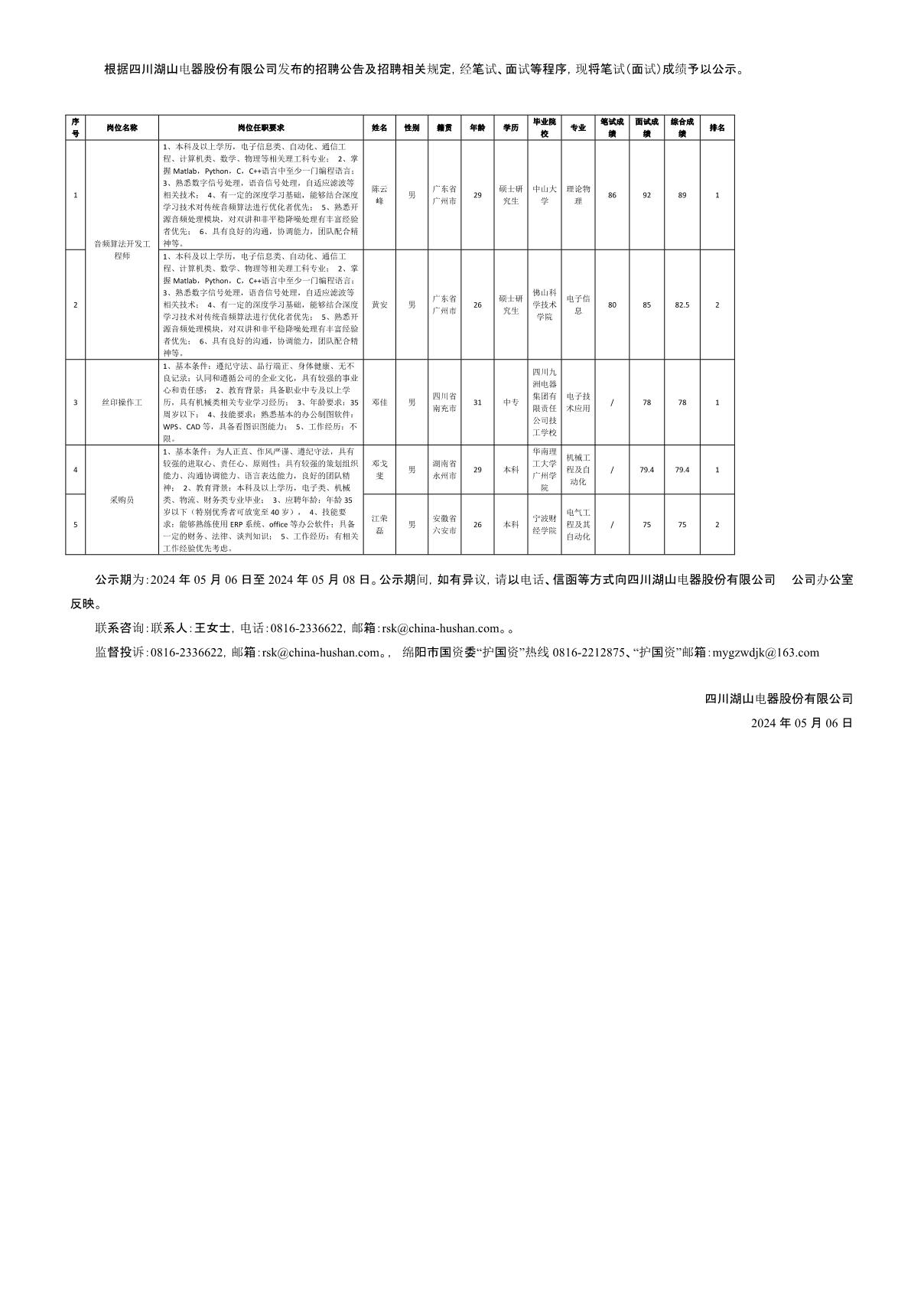 四川湖山電器股份有限公司關(guān)于招聘音頻算法開發(fā)工程師等崗位測(cè)試成績(jī)的公示
