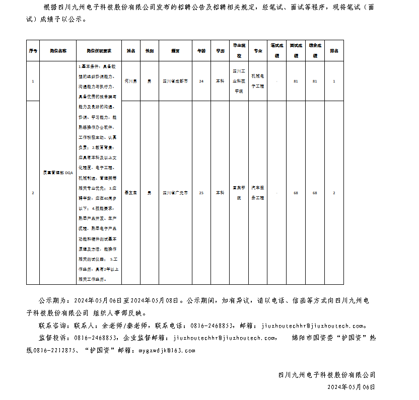 四川九州電子科技股份有限公司關于招聘DQA崗位測試成績的公示