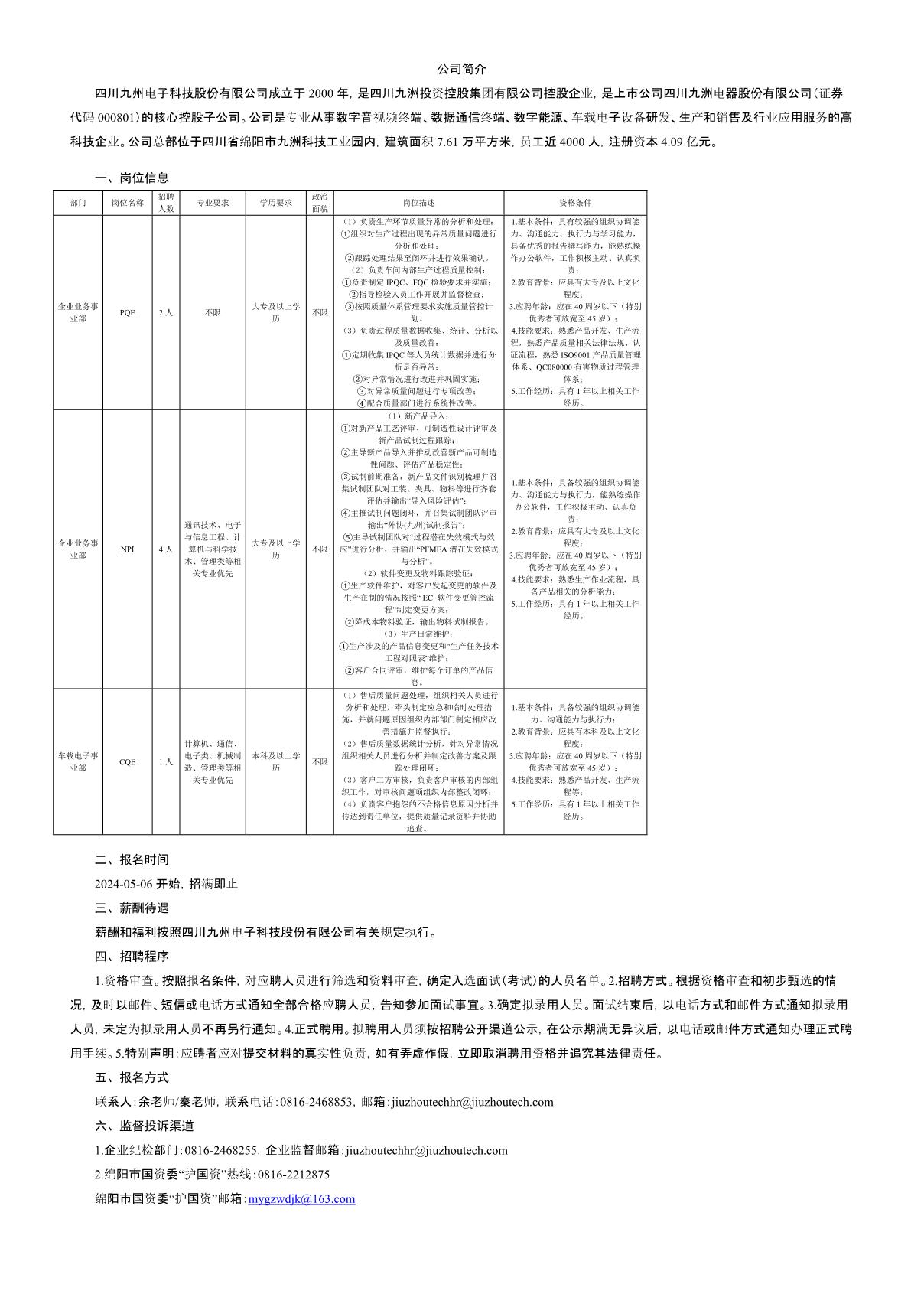 四川九州電子科技股份有限公司關(guān)于招聘PQE等崗位的公告