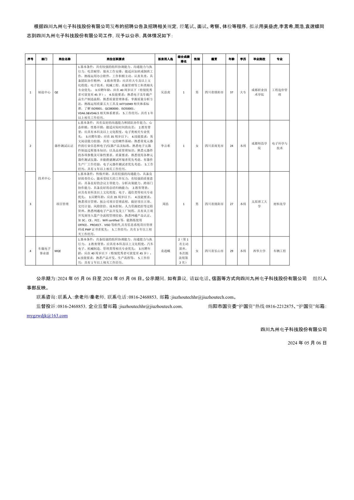 四川九州電子科技股份有限公司關于招聘QE等崗位擬錄用人員的公示