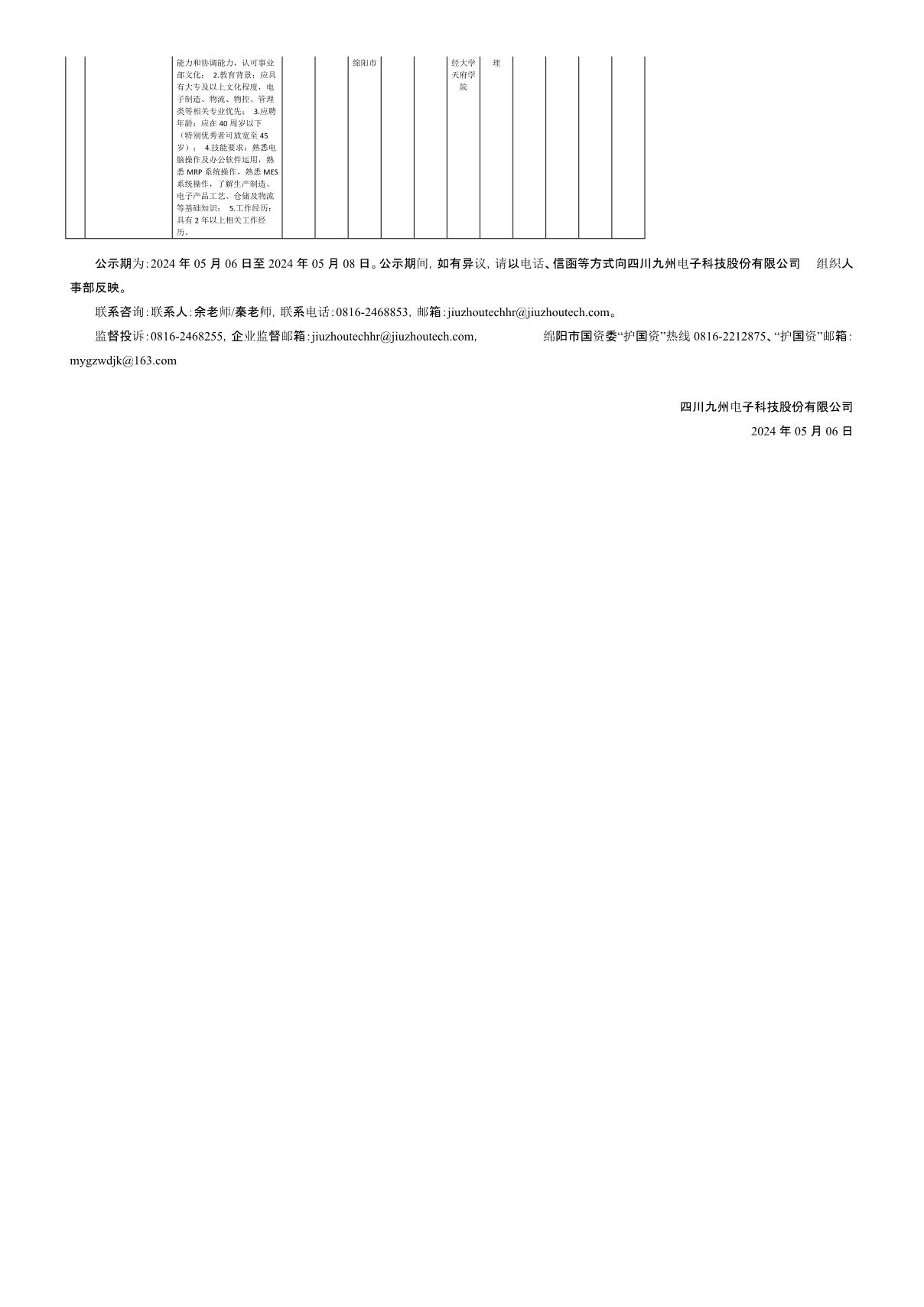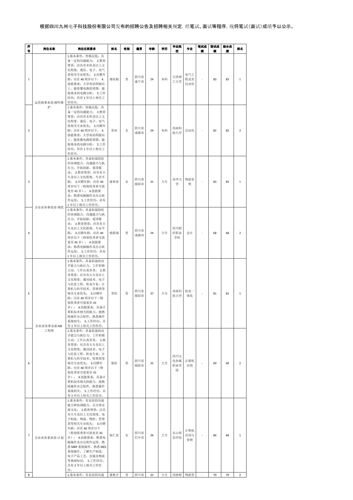 四川九州電子科技股份有限公司關于招聘計劃等崗位測試成績的公示