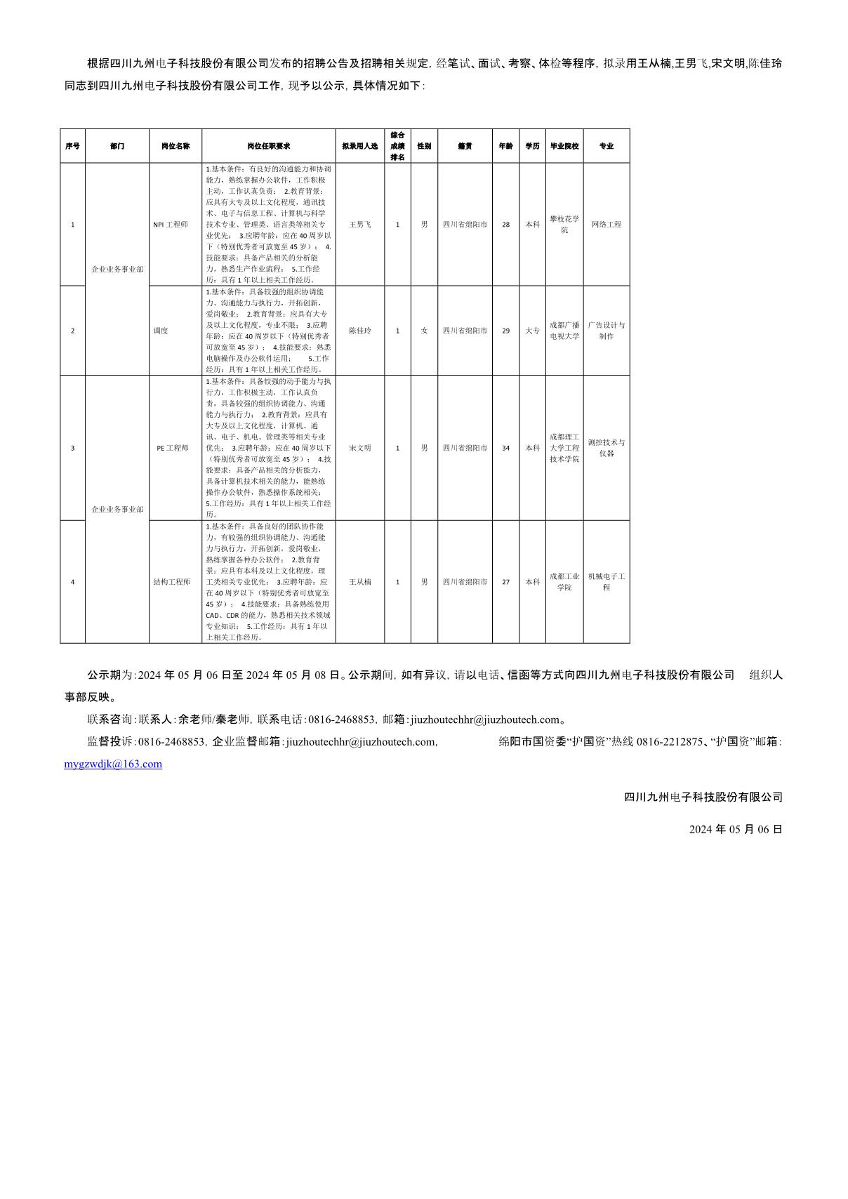 四川九州電子科技股份有限公司關(guān)于招聘結(jié)構(gòu)工程師等崗位擬錄用人員的公示