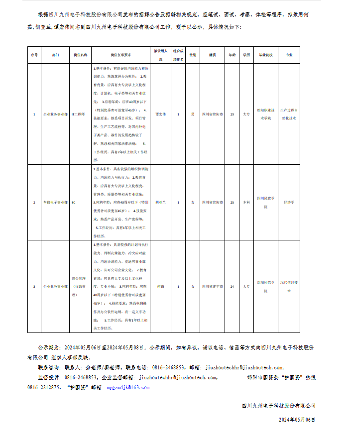 四川九州電子科技股份有限公司關于招聘綜合管理 (行政管理)等崗位擬錄用人員的公示