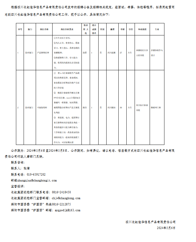 四川長虹佳華信息產品有限責任公司關于招聘中級架構師擬錄用人員的公示