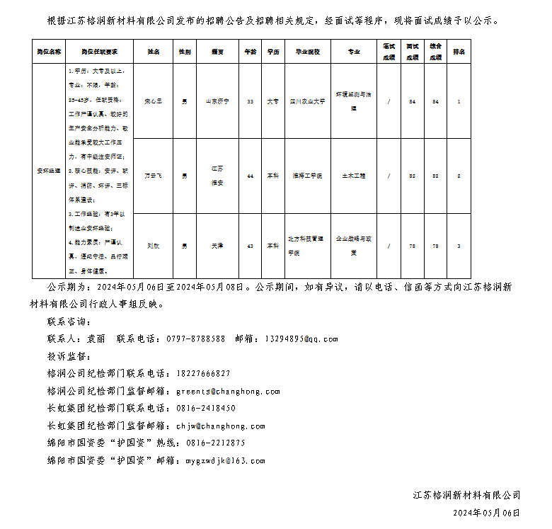 江蘇格潤新材料有限公司關于招聘安環經理崗位測試成績的公示
