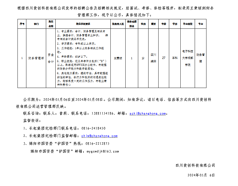 四川愛創(chuàng)科技有限公司關于招聘資金會計崗位擬錄用人員的公示