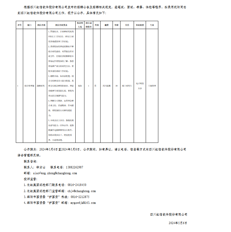 四川虹信軟件股份有限公司關于招聘戰(zhàn)略研究崗位擬錄用人員的公示