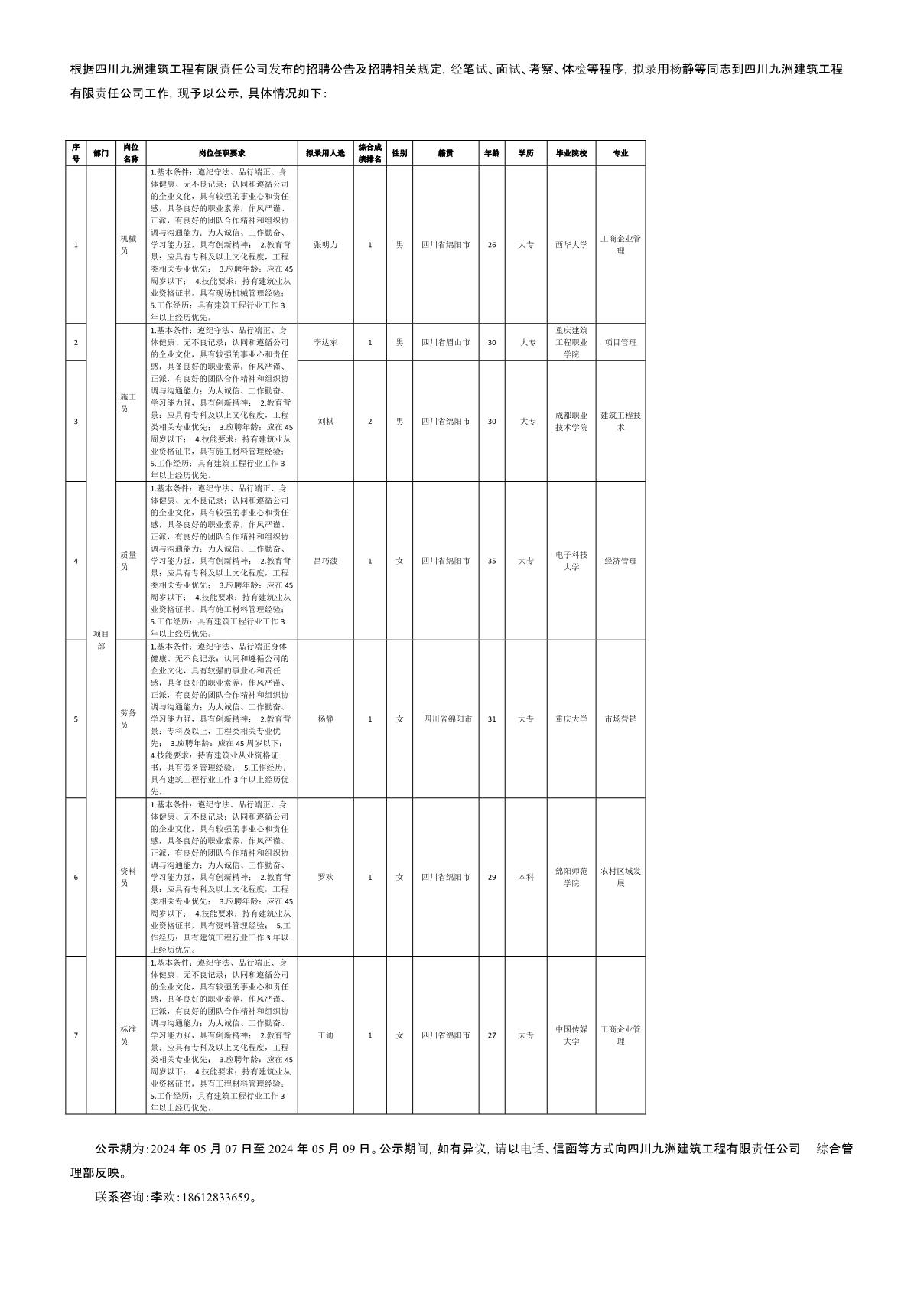 四川九洲建筑工程有限責任公司關于招聘 標準員等崗位擬錄用人員的公示