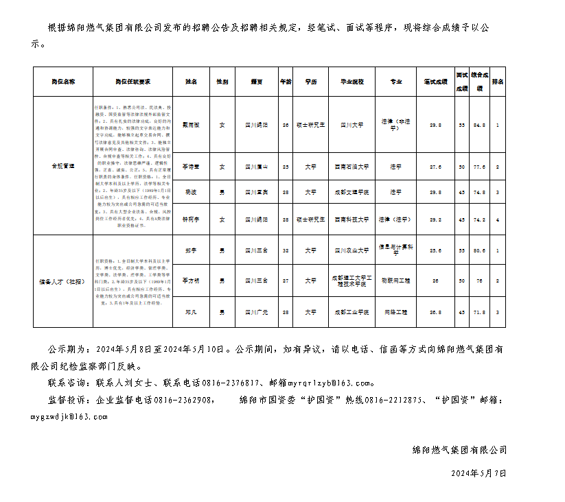 綿陽燃?xì)饧瘓F有限公司關(guān)于招聘合規(guī)管理等崗位測試成績的公示
